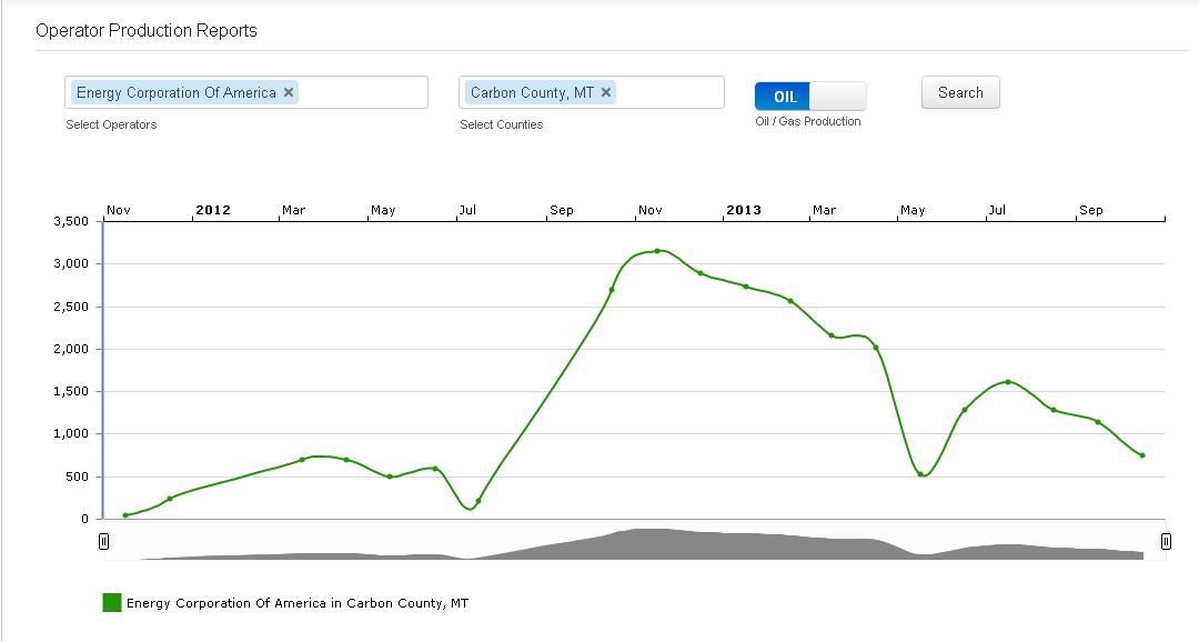 Total oil production in Carbon County has been declining slowly since 2000, from a high of nearly 56,189 barrels per month in July, 2000 to its current level of 31,788 barrels per month in August 2013.