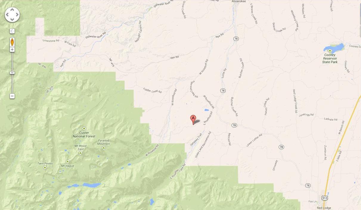 At the request of a commenter below, I have expanded the map. The A marker on the map represents the McKay Ranch Airport, just east of the ECA wells. Absarokee is at center north, Stillwater River Road runs along the top, Red Lodge is in the bottom right, and Highway 78 is at the center. Click on the map to expand it.