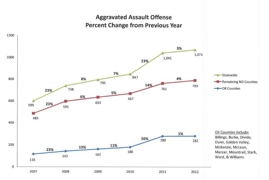 Aggravated assault was up 56% in the oil counties form 2010-11, and 14% statewide;