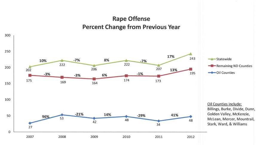 Rape has nearly doubled in the oil counties in the five years from 2007-12 while increasing only slightly in the non-oil counties: