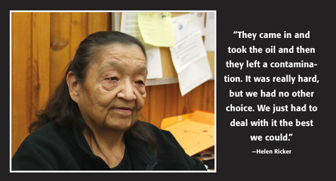 Ricker lives on the Fort Peck Indian Reservation three miles north of the town of Poplar, on the desolate BIA Road 75. Her home lies two miles southwest of the East Poplar oilfields, a large expanse crisscrossed with rutted dirt roads and spotted with blue, yellow and black oil pumps bobbing up and down like plastic drinking birds from a novelty store. The oilfield is not as productive as it used to be. But that soon may change.