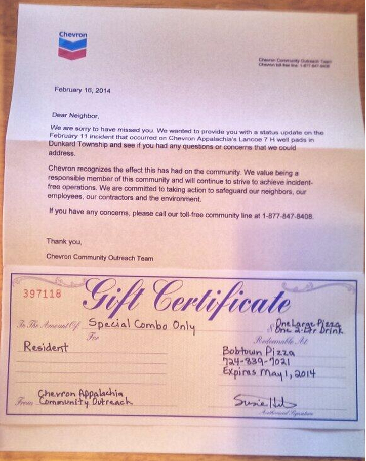 Chevron’s rather remarkable response was to send each resident of the area a coupon entitling them to a free pizza and a two-liter drink at a local pizzeria. The letter said in part that