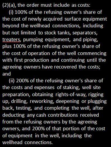 It’s worth noting that the provision requiring involuntary pooled owners to pay 200% of costs is much more oppressive than the forced pooling statute in North Dakota, which only stipulates a risk penalty.