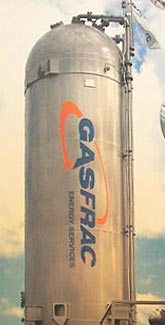 Fracking without water: A Calgary-based company called GasFrac‘s has developed a system of fracking that uses a gelled fluid containing propane. According to the company, this fluid eliminates the need for water, retains sand better than water, and eliminates the drainage and disposal of contaminated wastewater because the fluid merges into flow being extracted from the ground.