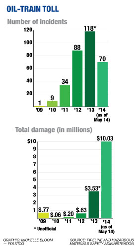 The property damage from oil-train accidents in 2014 is three times as high (as of May 14) as it was in all of 2013. We are also on pace to have more accidents this year than in 2013 — 70 accidents as of May 14 this year vs. 118 all of last year.- The train accidents have been spread all over the country. Politico reports that these “episodes are spreading as more refineries take crude from production hot spots like North Dakota’s Bakken region and western Canada, while companies from California and Washington state to Missouri, Pennsylvania, Virginia and Florida build or expand terminals for moving oil from trains to barges, trucks or pipelines.”