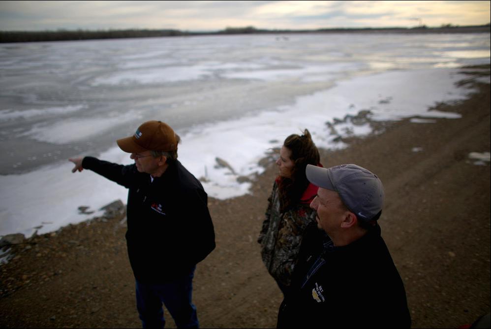 Mayor Rick Norby (right) and two staff members inspect one of Sidney’s wastewater lagoons, which needs to be replaced by modern treatment plant. Photo: David Gilkey, NPR