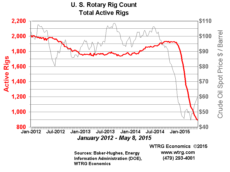 While oil prices have been high enough to cover the variable cost and allow many existing wells to continue operation, there have been few new wells dug. Nationally, the oil price bust has had a tremendous negative impact on the number of oil rigs in operation. As you can see by clicking on the graph at left, the number of operating rigs has been cut in half since January.