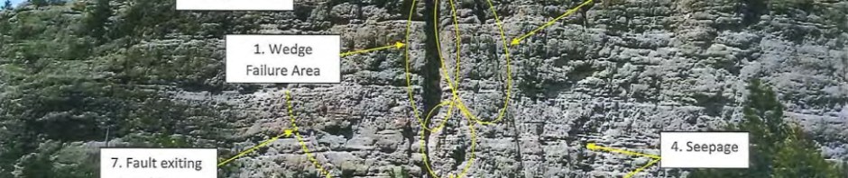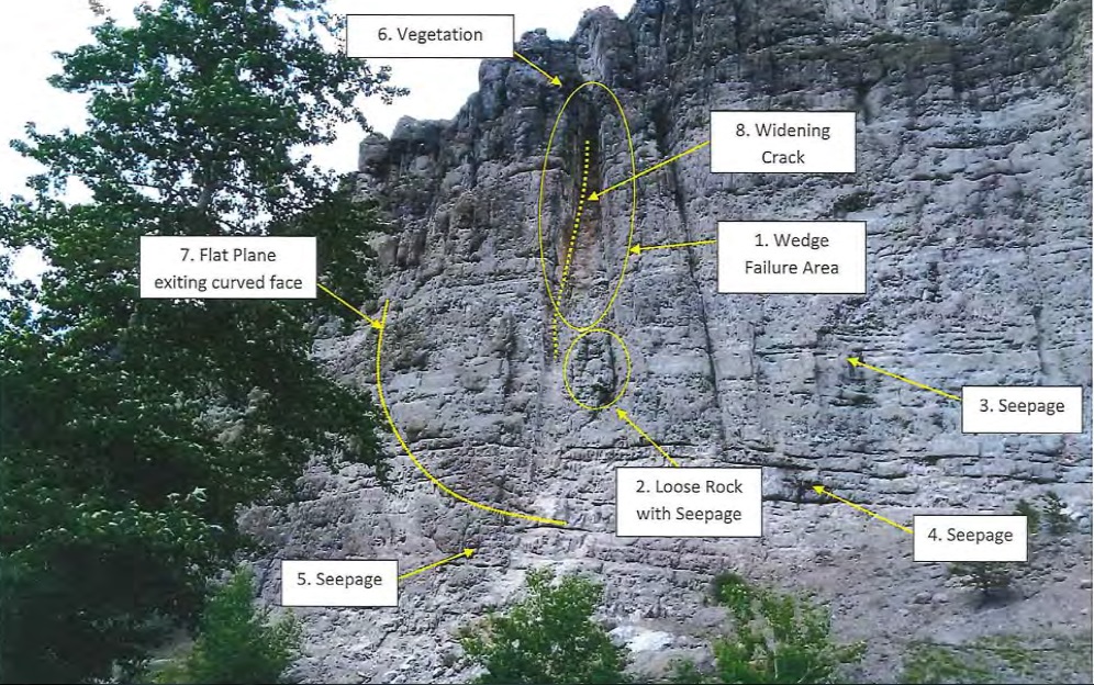- “Numerous areas…appear to be unstable. In the vicinity of label 2 (see photos below), several suitcase-sized rocks were observed which appeared to be relatively loose. Outside of the immediate wedge failure area, other portions of the rock face appear to have a high risk of wedge failures in the future. Areas #9 and #10 have discontinuities that intersect to create a wedge. They appear to be relatively stable when compared to the loose rocks in area #2, but the risk of failure still exists. A large rock is defined by the discontinuity shown with lines labeled #7 and #8. These discontinuities represent failure planes, and although no active movement was observed, there is a risk of future failure.