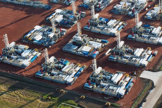 Stacked rigs sit idle at a depot in Dickinson, ND. Photo: Reuters/Andrew Cullen