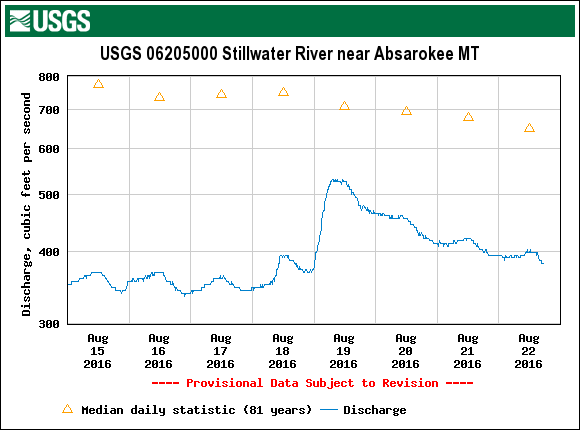 The chart at right depicts Stillwater River water levels at Absarokee over the last week. Average river levels over 81 years are shown in the triangles at the top; current levels are shown by the blue line.