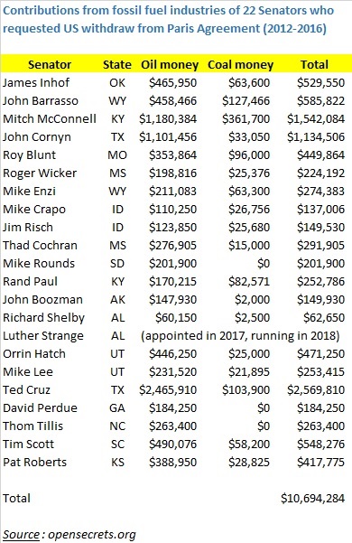 And who were these 22 Senators? Big recipients of contributions from the oil and coal industries, that’s who. Pulling out of Paris is a way for politicians who have been bought by fossil fuel industries to protect their sugar daddies. The chart below was created from data at opensecrets.org, totalling donations from the 22 signatories in the 2012, 2014, and 2016 election cycles.