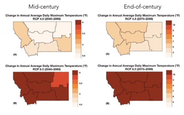 - The Climate Assessment looked at two scenarios for change in the future: a “business as usual” scenario in which there is little action to reduce carbon emissions, and a “stabilization” scenario in which action is taken to substantially reduce emissions. Montana is projected to continue to warm in all geographic locations, seasons, and under all emission scenarios throughout the 21st century. By mid century, Montana temperatures are projected to increase by approximately 4.5-6.0°F (2.5-3.3°C), depending on the stabilization scenario. By the end of the century, Montana temperatures are projected to increase 5.6-9.8°F (3.1-5.4°C) depending